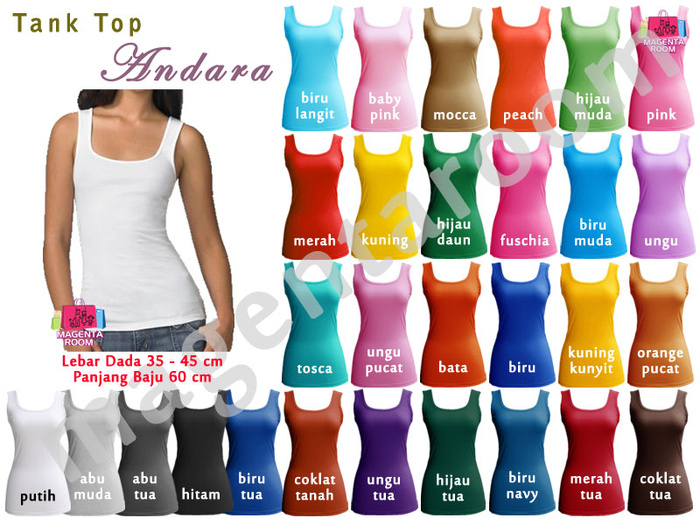 | Warna | Putih, Hitam, Kuning Kunyit, Biru Tua, Navy, Fuschia, Biru Langit, Peach, Hijau Terang, Baby Pink, Merah, Abu Muda, Bata, Maroon, Tosca, Ungu, Biru Royal, Ungu Tua, Abu Tua, Biru |