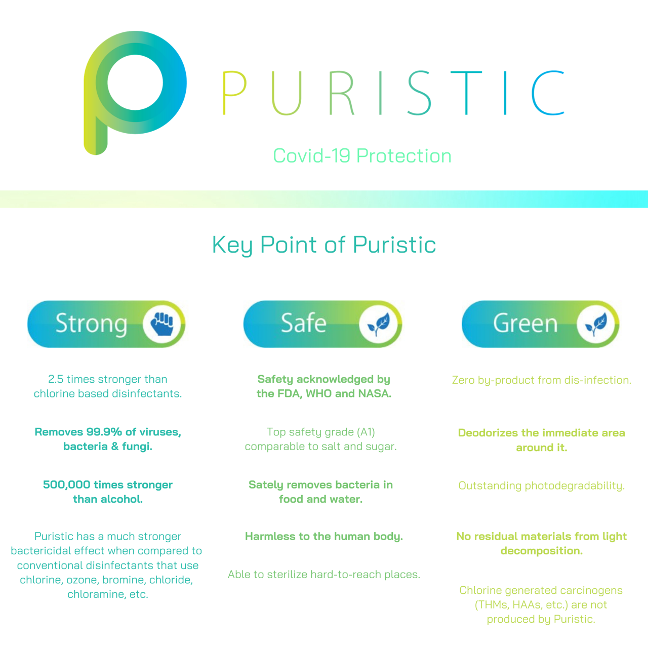 Puristic adalah Desinfeksi Udara yang mengandung Klorin Dioksida (ClO2) yang mudah digunakan dan sebagai alat fumigasi portabel yang secara efektif menciptakan lingkungan yang bersih dan aman.