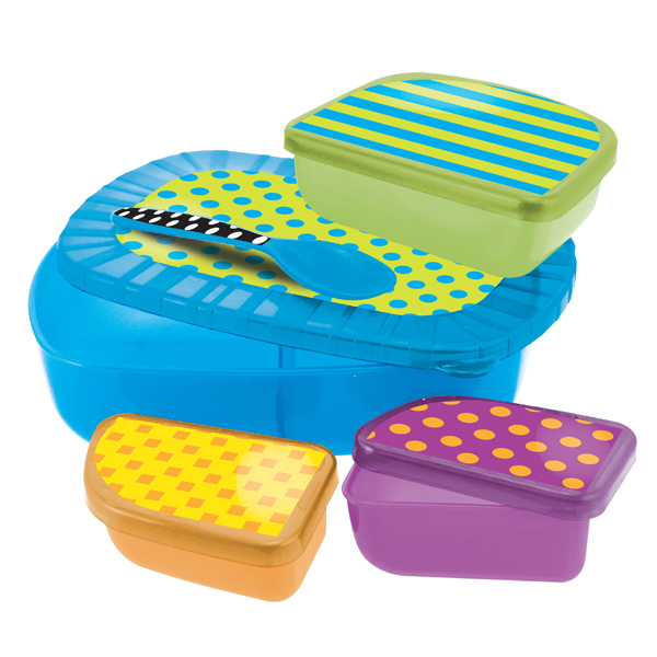 Terdiri dari 1 buah tempat makakan ukuran besar dan 3 buah tempat makanan ukuran kecil (cocok untuk porsi makanan yang sedikit) disertai masing masing penutup.